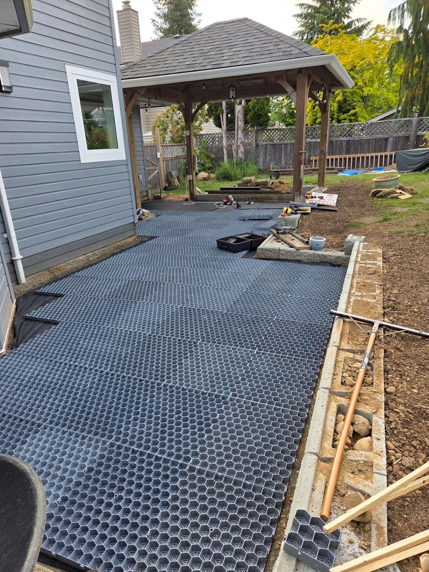 Installed by Big Country Drilling, this small residential patio highlights how the CORE CANA HD system creates a stable, permeable base. The interlocking grid provides precise leveling and prevents shifting or settling over time. Ideal for compact outdoor spaces, the system delivers long-term strength, efficient drainage, and a clean, modern finish, all with a quick and straightforward installation.
